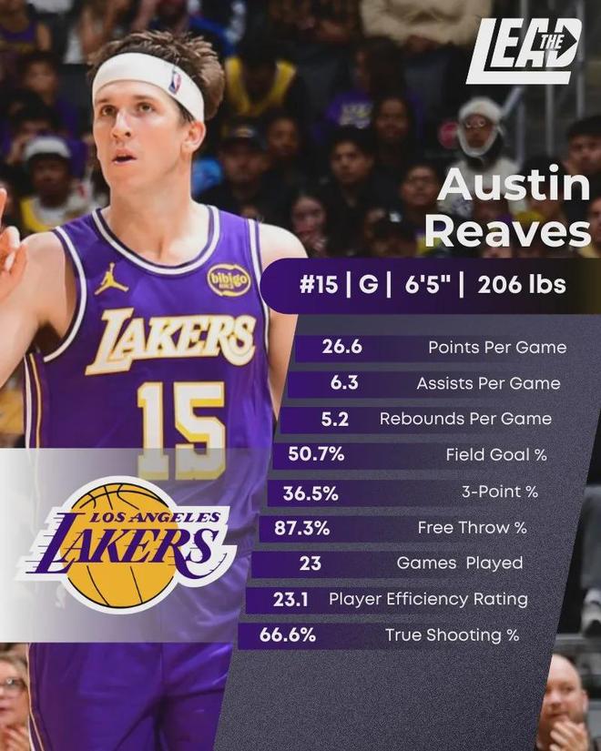 本赛季至今,里夫斯为湖人打了23场,其中22场首发。场均出战35.3分钟,得到26.6分5.2篮板6.3助攻1抢断3.3失误,三项命中率:50.7%,36.5%,87.3%。场均得分联盟第11,场均助攻联盟第20,场均三分命中数联盟第26。